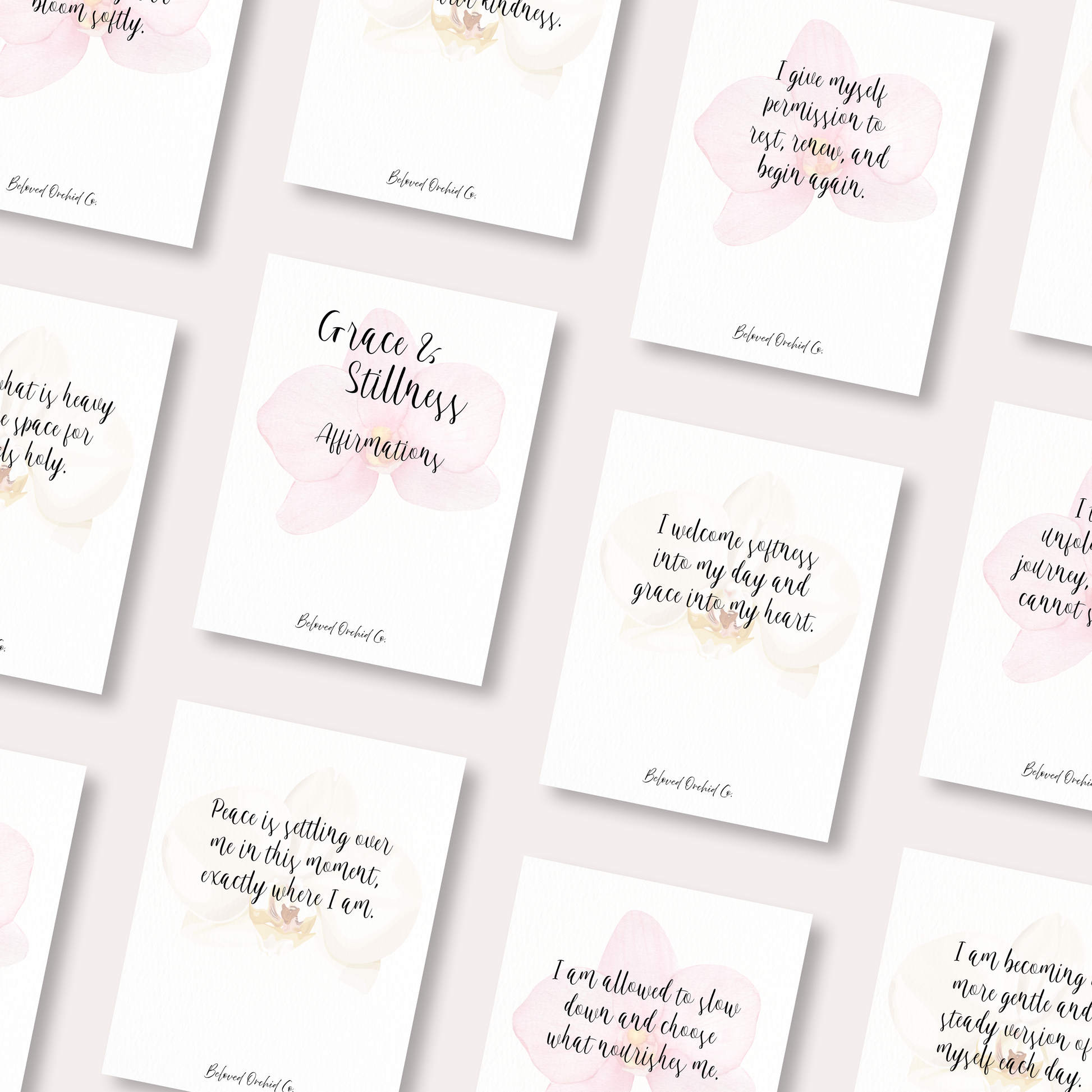 This calming, heart-centered collection features ten beautifully designed digital affirmation cards on delicate watercolor backgrounds — created in the signature feminine aesthetic of Beloved Orchid Co.